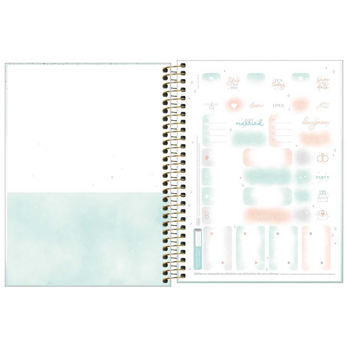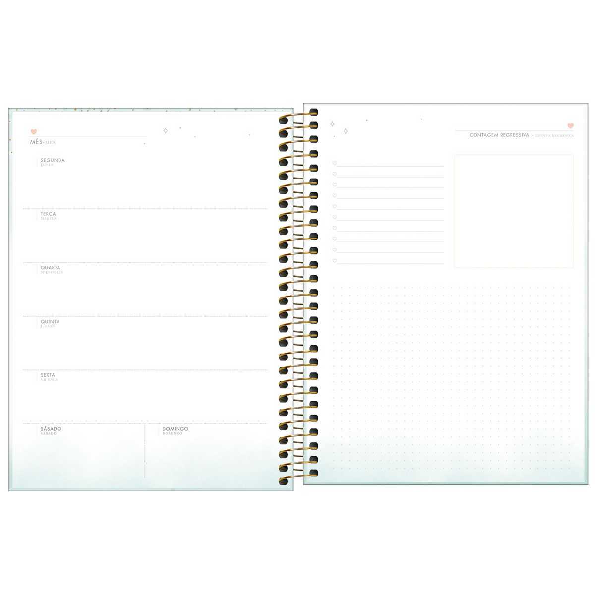 O Planner Wedding auxilia a futura noiva a planejar e preparar tudo para que o seu grande dia seja perfeito. Possui visões anual, mensal e semanal, permanentes, além capa dura, hot stamping e espiral dourado. Miolo com 80 folhas, formato 17,7cm x 24cm. Vem com folha de adesivos, bolsa em papel para guardar documentos e fechamento em elástico.