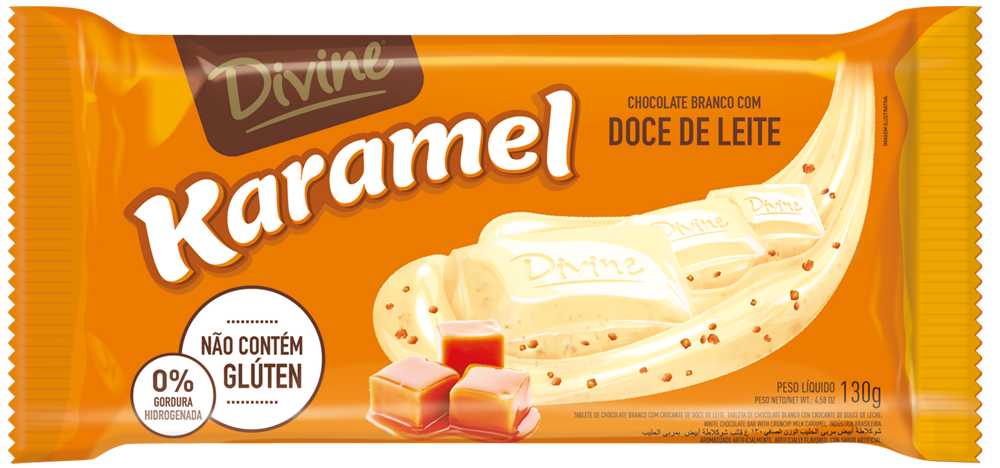 INFORMAÇÃO NUTRICIONAL: Porção de 25g (1/5 da barra). Quantidade por porção (%VD*) Valor calórico 141kcal=592kJ (7%), Carboidratos 14g (4%); Proteínas 1,6g (2%); Gorduras Totais 8,8g (16%); Gorduras Saturadas 5,4g (24%); Gorduras Trans 0g (VD não estabelecido); Fibra alimentar 0g (0%); Sódio 26mg (1%).*% Valores diários de referência com base em uma dieta de 2.000 kcal ou 8.400 kJ. Seus valores diários podem ser maiores ou menores dependendo de suas necessidades energéticas. INGREDIENTES: açúcar, manteiga de cacau, leite em pó integral, leite em pó desnatado, crocante sabor doce de leite (açúcar, glucose, leite em pó, manteiga, sal, emulsificantes: monoglicerídeo de ácidos graxos e aroma), sal, emulsificantes: lecitina de soja e ésteres de ácido ricinoléico interesterificado com poliglicerol, aromatizante artificial. NÃO CONTÉM GLÚTEN. ALÉRGICOS: CONTÉM DERIVADOS DE LEITE E SOJA. PODE CONTER AMENDOIM E CASTANHA-DE-CAJU. CONTÉM LACTOSE.
