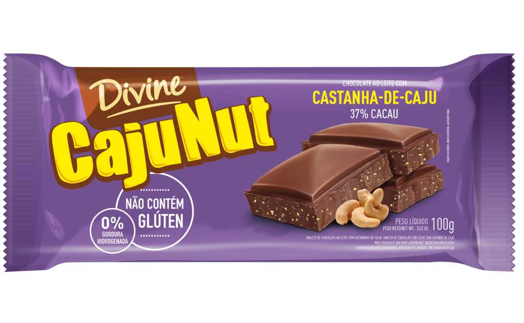 INFORMAÇÃO NUTRICIONAL: Porção de 25g (1/4 barra). Quantidade por porção (%VD*) Valor energético 138kcal=579kJ (7%), Carboidratos 12g (4%); Proteínas 2g (3%); Gorduras Totais 8,8g (16%); Gorduras Saturadas 4,9g (22%); Gorduras Trans 0g (VD não estabelecido); Fibra alimentar 0,7g (3%); Sódio 15mg (1%).*% Valores diários de referência com base em uma dieta de 2.000 kcal ou 8.400 kJ. Seus valores diários podem ser maiores ou menores dependendo de suas necessidades energéticas. INGREDIENTES: açúcar, manteiga de cacau, leite em pó integral, massa de cacau, castanhas-de-caju, emulsificantes: lecitina de soja e ésteres de ácido ricinoléico interesterificado com poliglicerol, aromatizante artificial. NÃO CONTÉM GLÚTEN. ALÉRGICOS: CONTÉM CASTANHA-DE-CAJU E DERIVADO DE LEITE E SOJA. PODE CONTER AMENDOIM, AMÊNDOAS, AVELÃ, CASTANHA-DO-PARÁ E NOZES. CONTÉM LACTOSE.