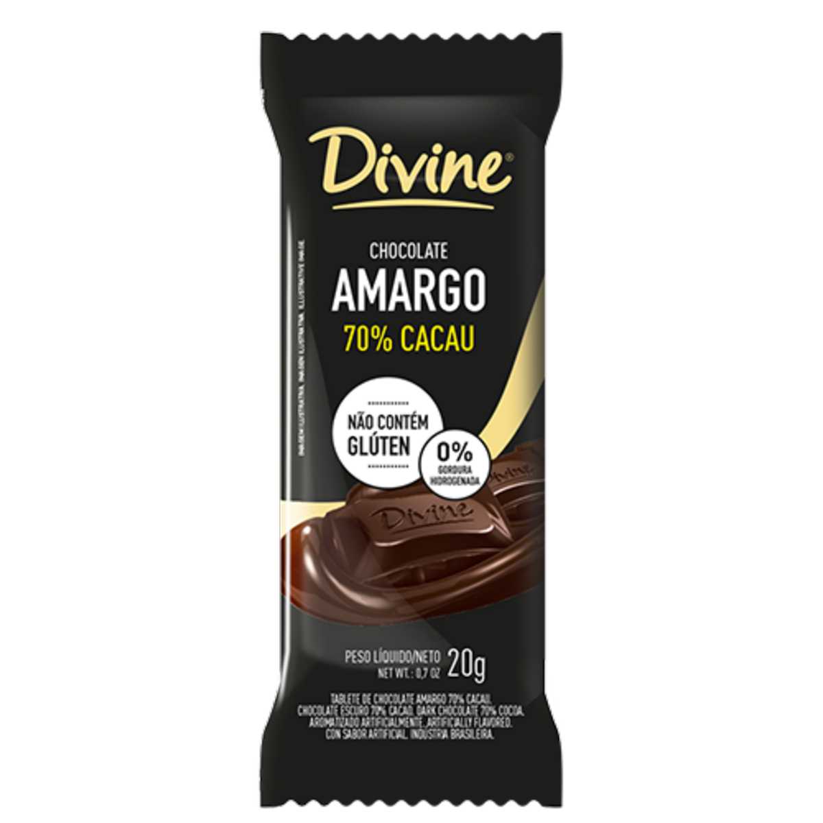 INFORMAÇÃO NUTRICIONAL: Porção de 20g (1 unid). Quantidade por porção (%VD*) Valor energético 108kcal=453kJ (5%), Carboidratos 6,6g (2%); Proteínas 1,5g (2%); Gorduras totais 8g (14%); Gorduras Saturadas 4,8g (22%); Gorduras Trans 0g (VD não estabelecido); Fibra alimentar 2,4g (10%); Sódio 0mg (0%).*% Valores diários de referência com base em uma dieta de 2,000 kcal ou 8,400 kJ. Seus valores diários podem ser maiores ou menores dependendo de suas necessidades energéticas. INGREDIENTES: massa de cacau, açúcar, manteiga de cacau, emulsificante: ésteres de ácido ricinoléico interesterificado com poliglicerol, aromatizante artificial. NÃO CONTÉM GLÚTEN. ALÉRGICOS: PODE CONTER LEITE, SOJA, AMENDOIM, CASTANHA-DE-CAJU.