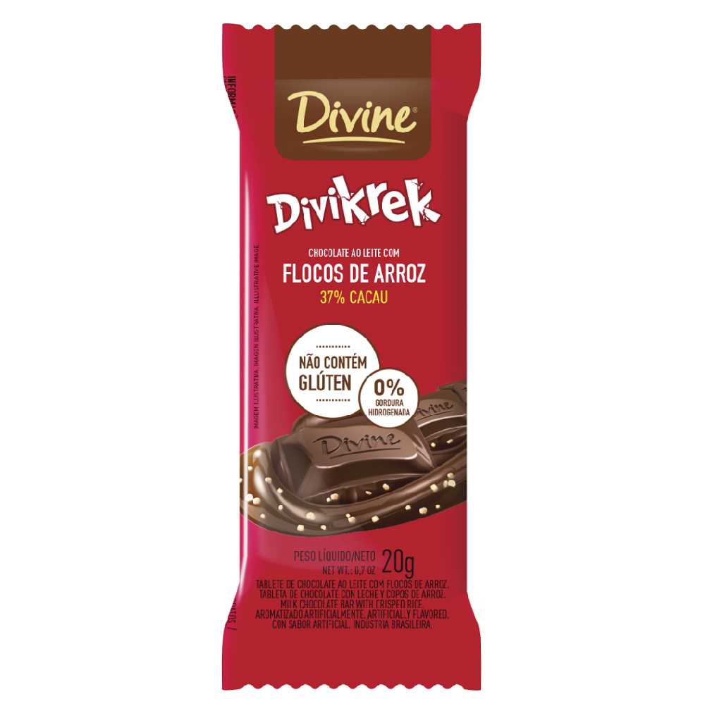 INFORMAÇÃO NUTRICIONAL: Porção de 20g (1 unid). Quantidade por porção (%VD*) Valor calórico 106kcal=443kJ (5%), Carboidratos 11g (4%); Proteínas 1,4g (2%); Gorduras totais 6,2g (11%); Gorduras Saturadas 3,8g (17%); Gorduras Trans 0g (VD não estabelecido); Fibra alimentar 0,6g (2%); Sódio 12mg (1%).*% Valores diários de referência com base em uma dieta de 2,000 kcal ou 8,400 kJ. Seus valores diários podem ser maiores ou menores dependendo de suas necessidades energéticas. INGREDIENTES: açúcar, manteiga de cacau, leite em pó integral, liquor de cacau, flocos de arroz (farinha arroz e maltodextrina), emulsificantes: lecitina de soja e ésteres de ácido ricinoléico interesterificado com poliglicerol, aromatizante artificial. NÃO CONTÉM GLÚTEN. ALÉRGICOS: CONTÉM DERIVADOS DE LEITE E SOJA. PODE CONTER AMENDOIM, CASTANHA-DE-CAJU. CONTÉM LACTOSE.