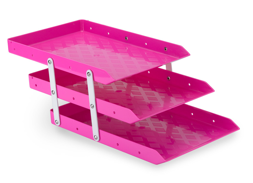 Caixa de correspondência tripla, articulada, na cor rosa, marca Waleu, fabricada em acrílico super resistente. Ideal para uso na organização de papéis em casa ou escritório.