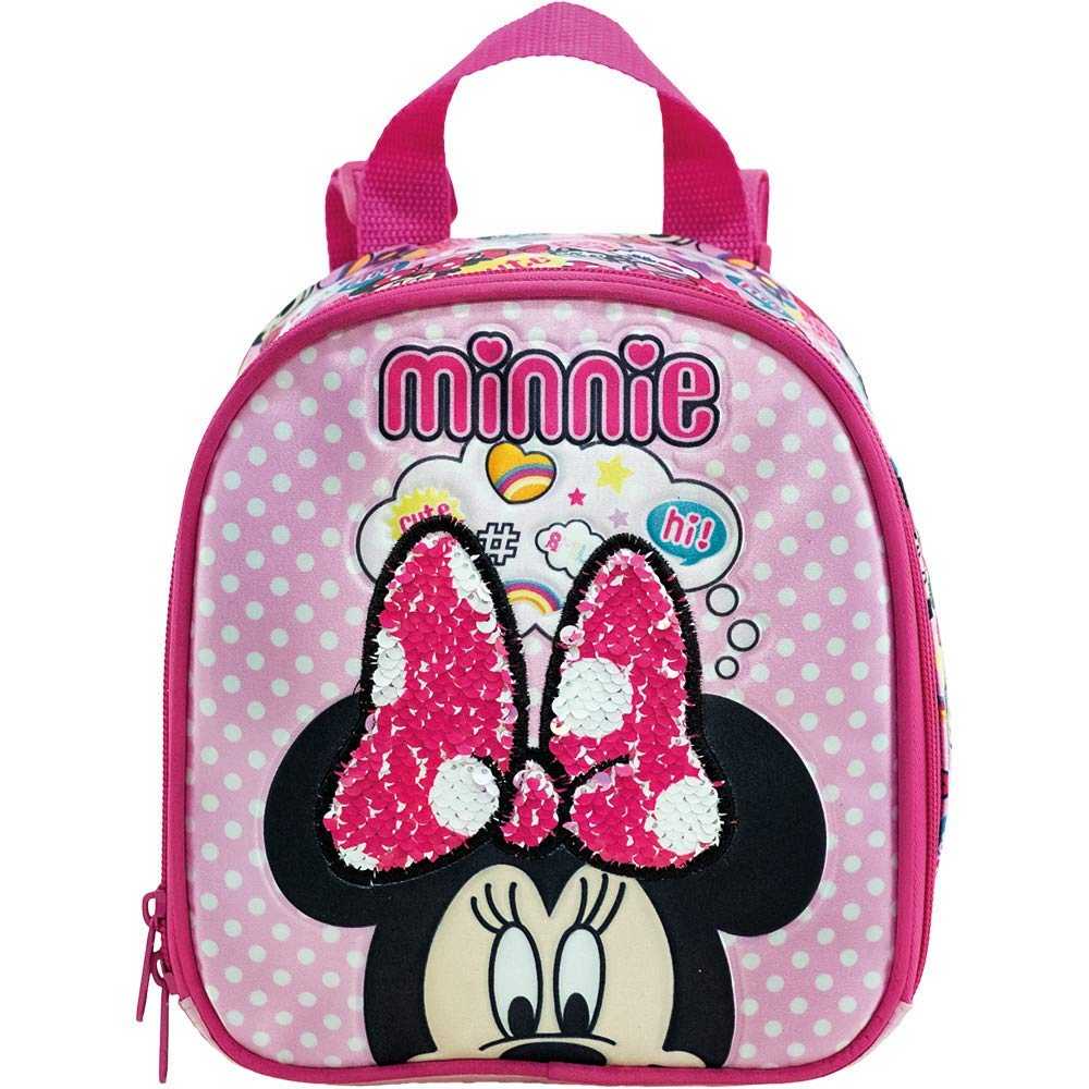 Linha Magic Bow de Minnie Mouse. Sua lancheira é produzida em cetim estampado e seu painel frontal possui aplicação de lantejoulas reversíveis no laço. Seu interior é revestido com tecido que ajuda a manter o frescor dos alimentos por mais tempo. Possui alça ajustável e suporte para encaixe na haste do carrinho das malas de rodinha. Possui certificação Inmetro.