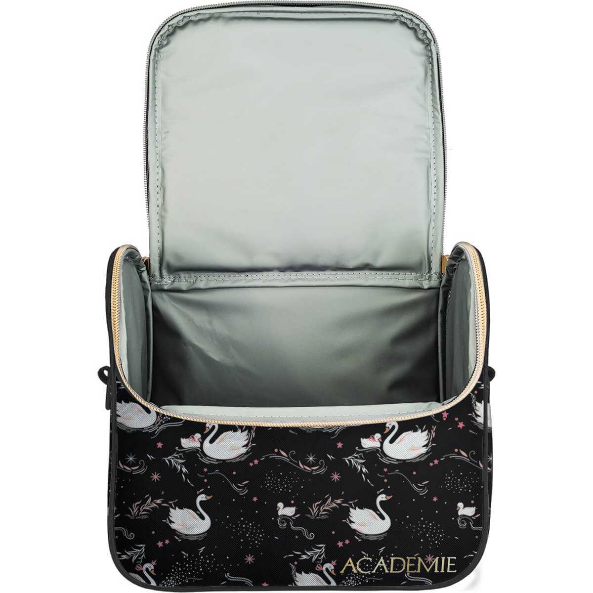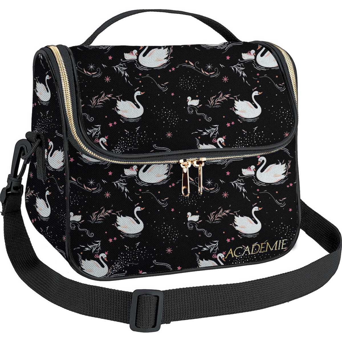 A Lancheira Tiracolo Académie Cisne é resistente e possui material interno que ajuda a conservar a temperatura dos alimentos, além de ser de fácil limpeza. Possui alça removível.
