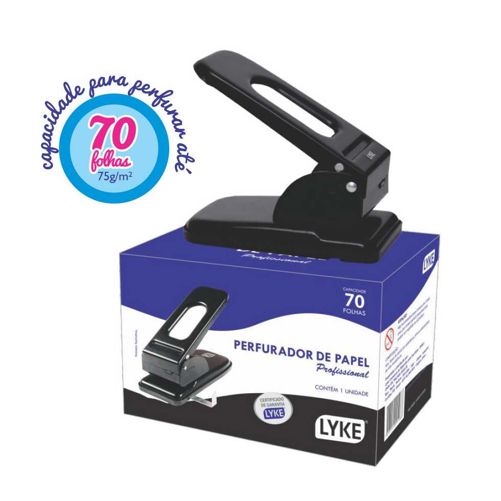 Perfurador metálico com apoio emborrachado para maior conforto, design inovador, possui régua, trava, depósito de resíduos e base antideslizante